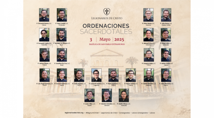 (ZENIT Noticias / Roma).- El sábado 3 de mayo, 23 religiosos de la congregación de los Legionarios de Cristo recibirán la ordenación sacerdotal por parte del cardenal Kevin Farrell, prefecto del Dicasterios para los laicos, familia y vida. La ordenación sacerdotal tendrá lugar en la Basílica de San Pablo Extramuros y será retransmitida en vivo, en varios idiomas, a través del canal institucional de YouTube los Legionarios de Cristo.