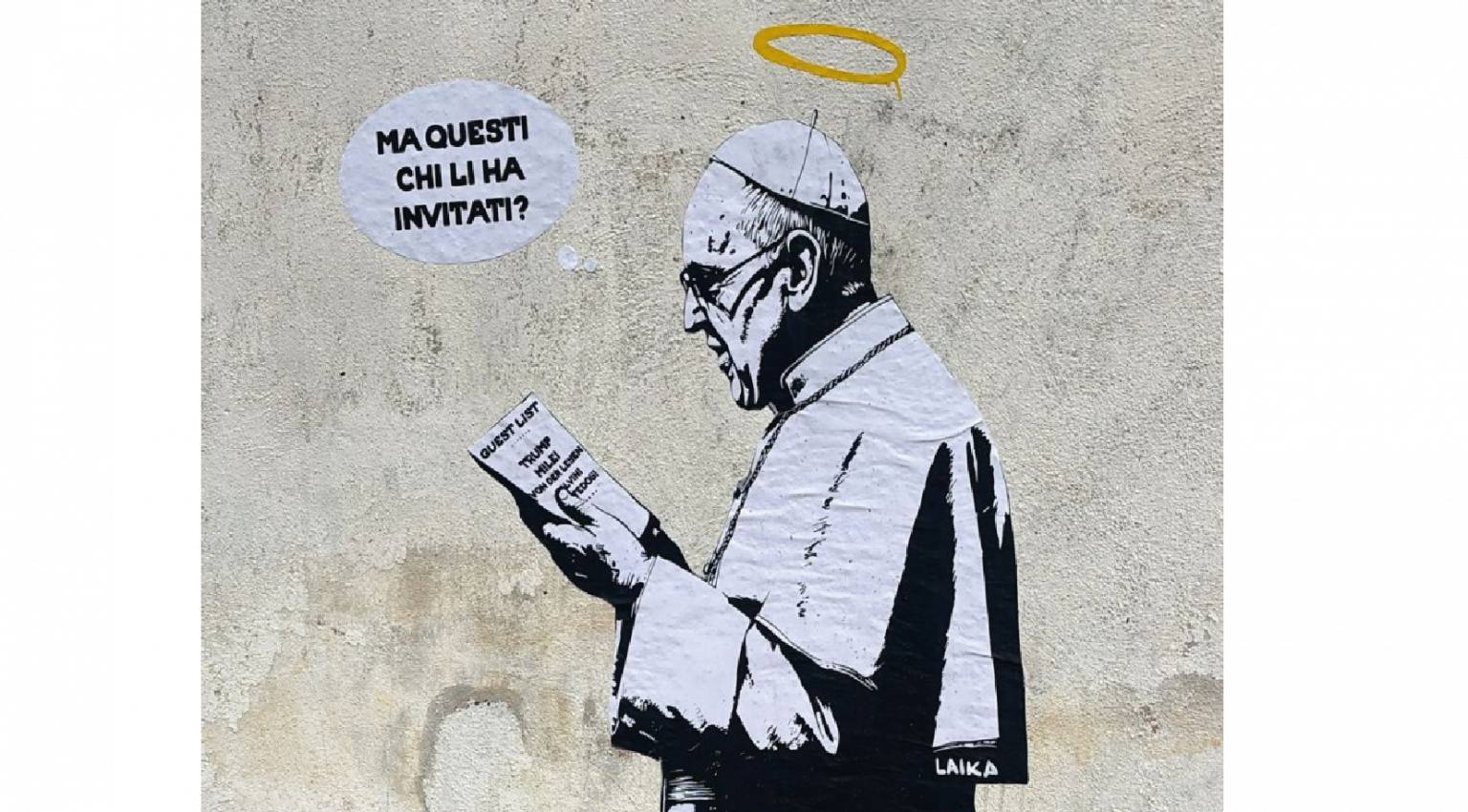 Laika pinto su nuevo mural a pocos metros de San Pedro, en via Piccolomini. En ella se ve al Papa Francisco leyendo una lista de personas que acudirán a su funeral: Trump, Milei, Von der Leyen, Salvini y Piantedosi. Y en el grafiti se pregunta el difunto pontífice: «¿Pero quién invitó a esta gente?».
