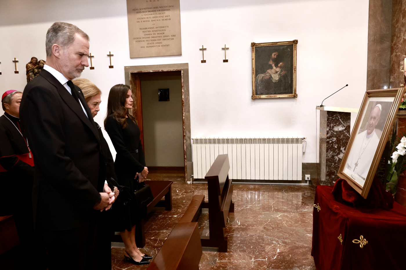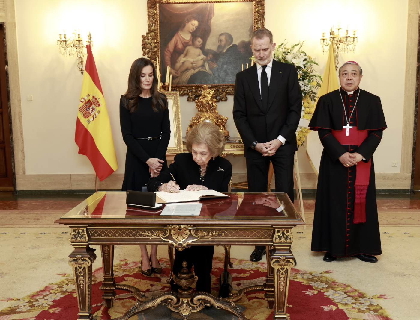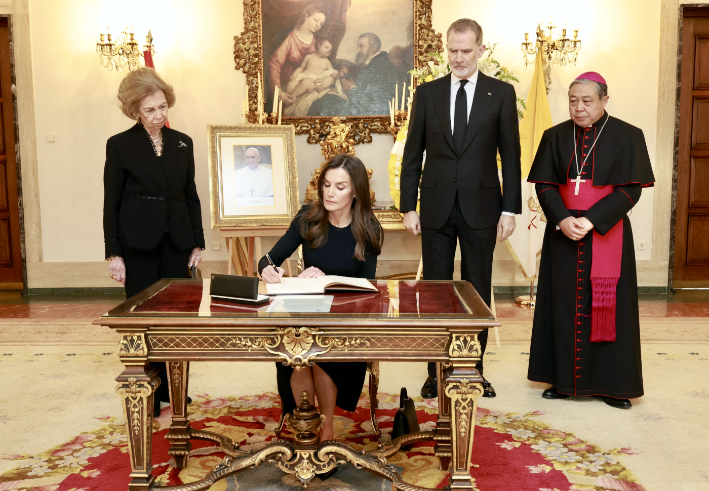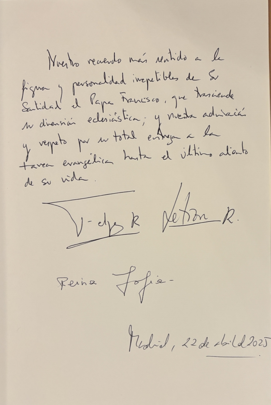 A su llegada, fueron recibidos por el Nuncio Apostólico de la Santa Sede en España, Bernardito Auza, quien les dio la bienvenida. Seguidamente, los Reyes y Doña Sofía firmaron el libro de condolencias abierto en memoria del Pontífice, dejando constancia de su profundo pesar y reconocimiento a su legado espiritual.